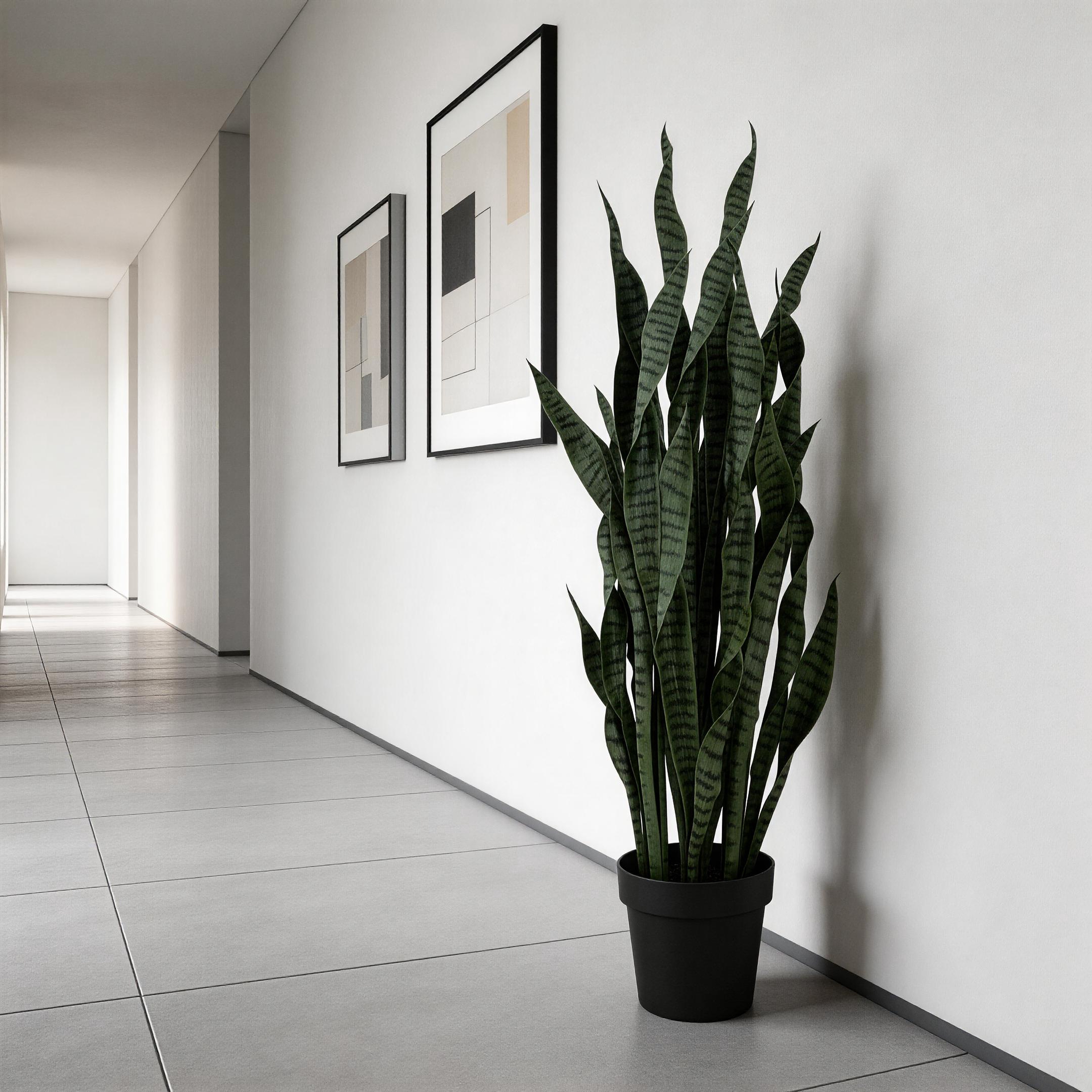 The 120cm Artificial Twisted Dark Green Snake Plant features sculptural twisted sansevieria leaves in deep green tones, arranged in a black pot for a modern architectural look. This tall artificial snake plant adds strong vertical presence, ideal for floor décor, contemporary interiors, offices, showrooms, and commercial design projects. Durable construction and flexible shaping provide long-lasting greenery without upkeep.