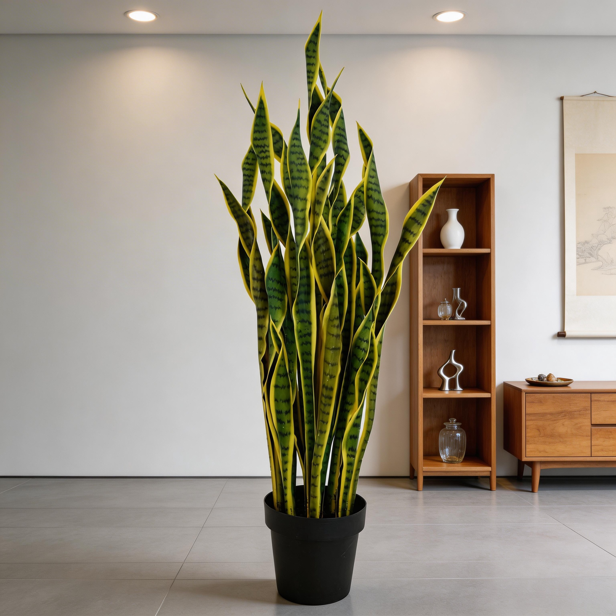 The 120cm Artificial Twisted Yellow-Edged Snake Plant highlights twisted sansevieria leaves with distinctive yellow margins, creating a bold sculptural silhouette in a black pot. Designed as a tall statement plant, it is ideal for interior corners, offices, retail displays, hospitality spaces, and architectural décor. Maintenance-free and realistic, this faux snake plant supports wholesale decorative applications.