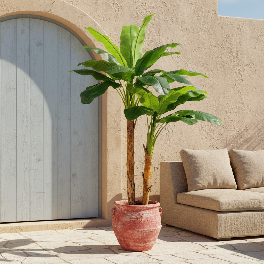 The 180cm Artificial Banana Tree (Double Trunks) showcases a fuller and more layered appearance with two trunks supporting abundant tropical foliage. The varying leaf directions create a more dynamic and natural visual effect.