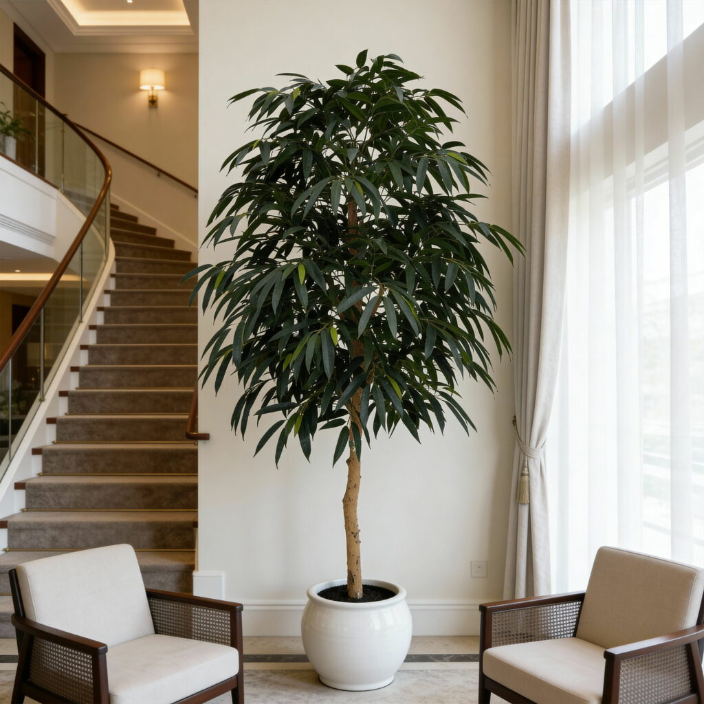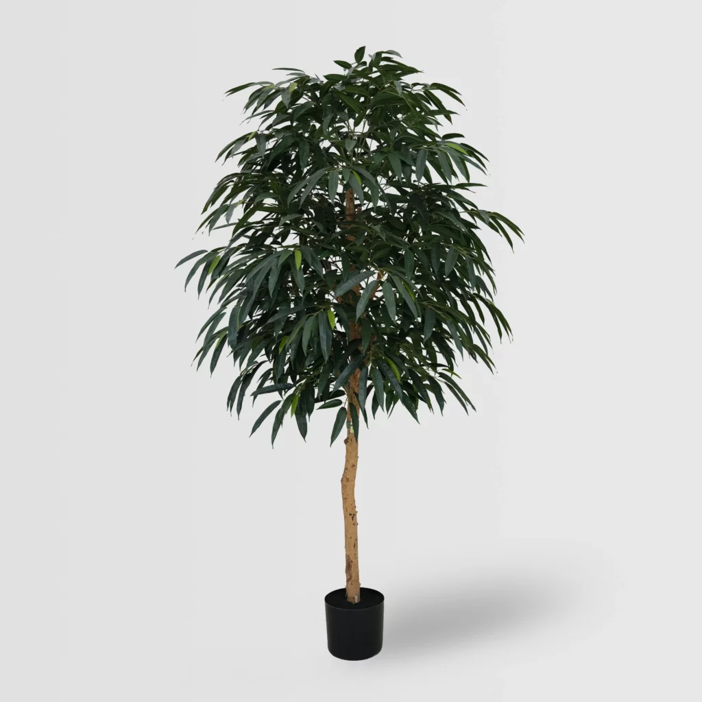 The 240cm Artificial Mango Tree (KD) is designed with a thick solid real wood trunk and dense deep-green leaves, creating a bold and highly realistic appearance. This tall faux leaf tree delivers strong visual impact without fruits, emphasizing its lush canopy and natural structure. Ideal for hotel lobbies, commercial spaces, showrooms, and high-ceiling interiors, it is a premium solution for large, tall artificial greenery installations and professional B2B décor projects.