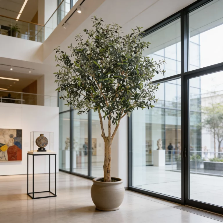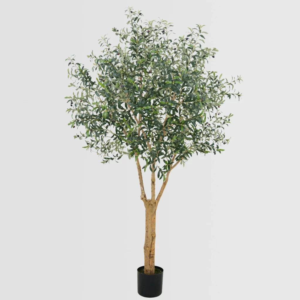 The 270cm Artificial Olive Tree (KD) features a thick, solid-looking main trunk with realistic texture and natural mud-colored branches. Designed with dark green olive leaves and red-black faux olive fruits, this tall fake olive plant creates a strong Mediterranean statement for large interiors. Adjustable branches allow flexible shaping, making it ideal for hotel lobbies, showrooms, luxury residences, and large B2B décor projects seeking bold yet refined greenery.