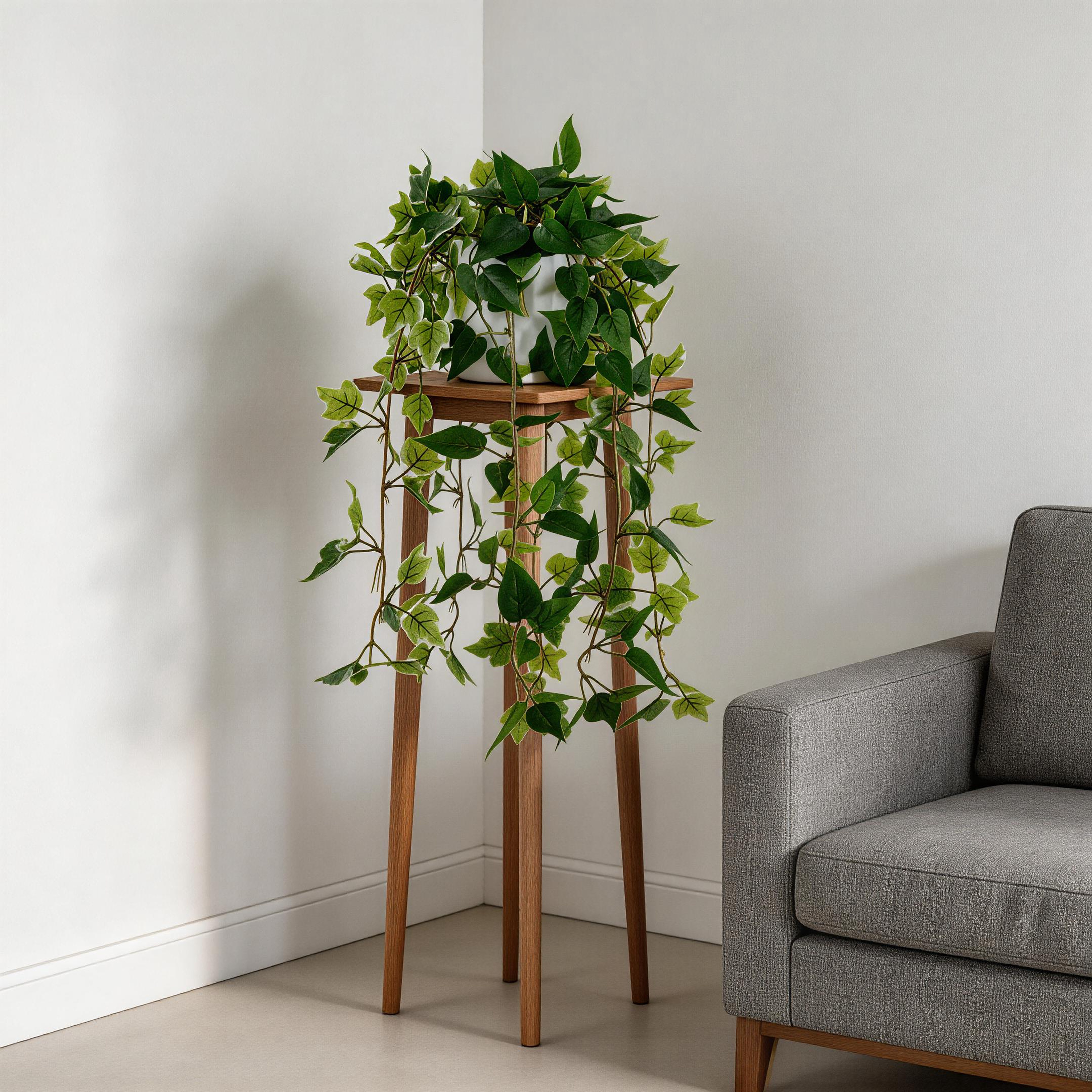 The Artificial Variegated Ivy & Pothos Hanging Plant 87cm showcases layered trailing vines featuring patterned artificial ivy leaves paired with fresh green pothos foliage in a modern white pot. The mixed greenery creates depth and a realistic cascading effect suited for living rooms, wall décor, offices, retail environments, cafés, and styling projects. Designed for long-term use, this faux hanging greenery offers consistent color without maintenance and supports bulk supply needs.
