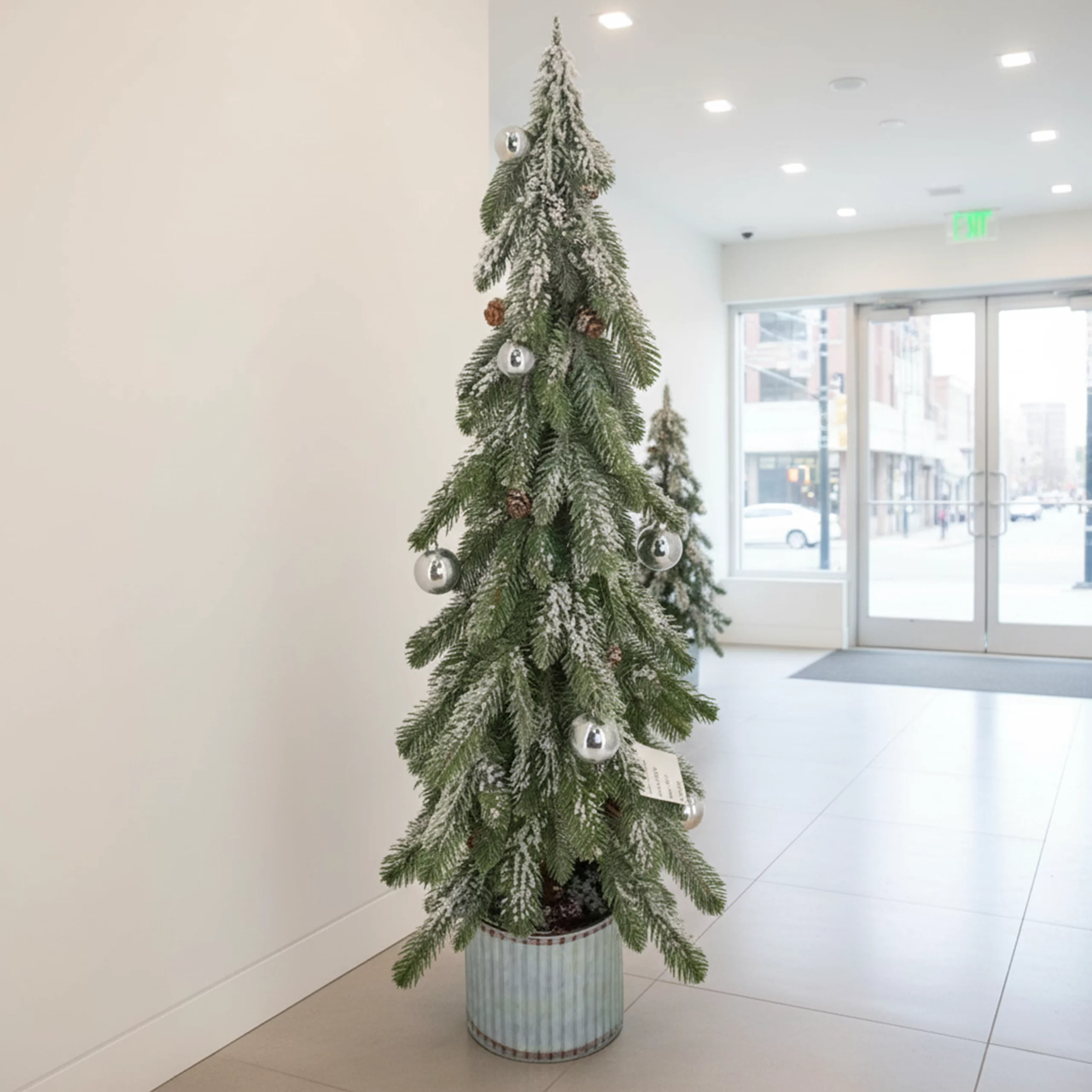 The 88cm Artificial Snowy Pine Needle Bell Plant showcases layered frosted pine foliage combined with decorative bell accents, forming a tall and eye-catching Christmas arrangement. Its fuller height makes it suitable for entryways, corners, storefronts, hotel lobbies, and event styling, adding vertical holiday impact. Designed for long-term use, this large faux plant requires no upkeep, making it ideal for wholesale holiday installations and commercial décor projects.
