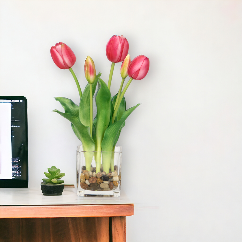 Product Name: 28 CM Real Touch Tulips Flowers For Hotel Home Office Decoration Item No.: 23STZ293198 Height: 28 cm Color: Pink Material: Plastic, PU, Glass MOQ: 500 PCSProduct Description